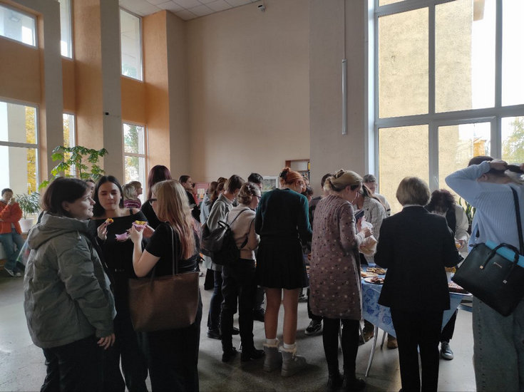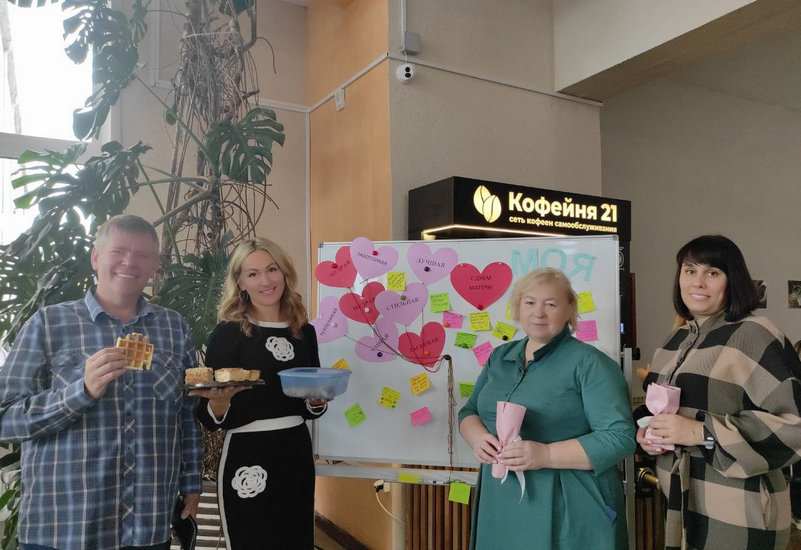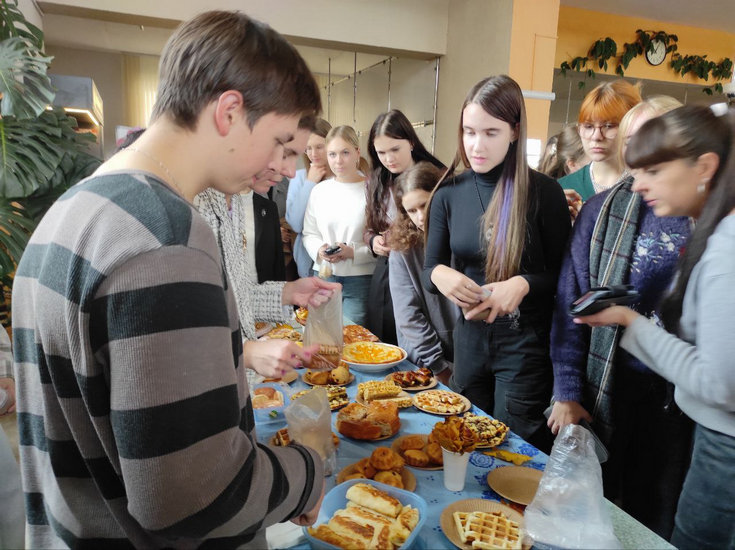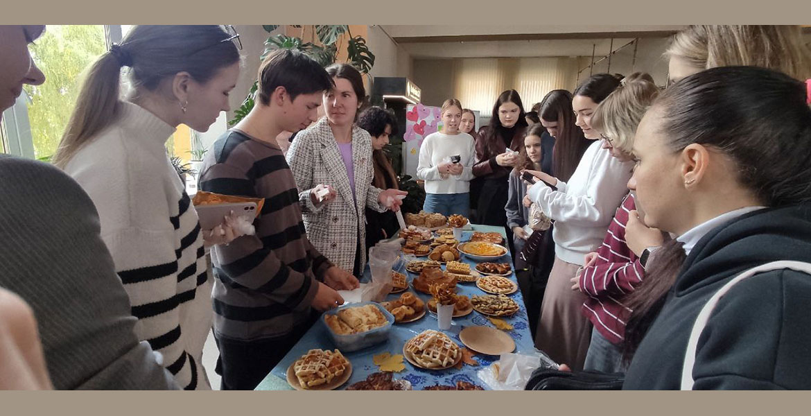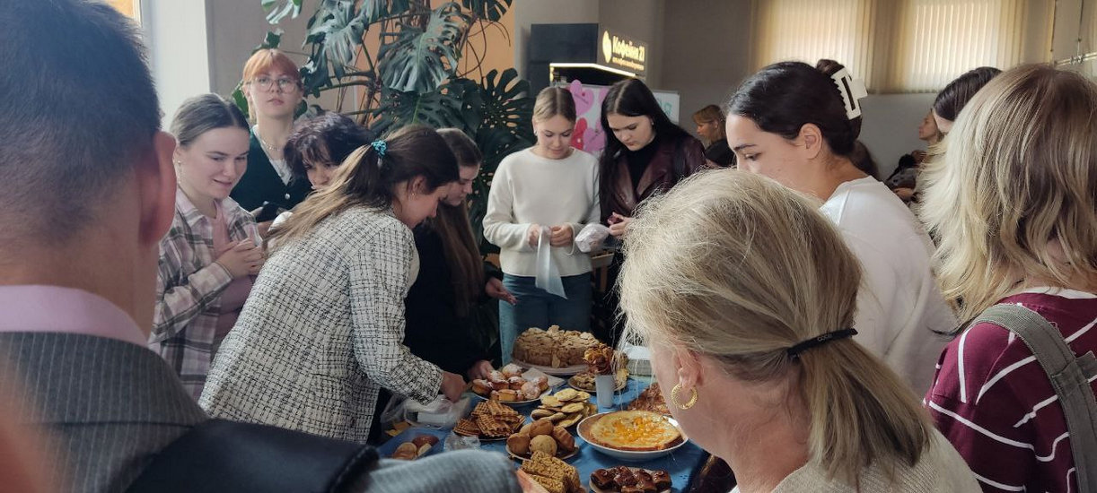 С теплотой и душевностью студенты и преподаватели испекли угощения по семейным рецептам: пироги, вафли, кексы и блинчики. Присутствующие на празднике наслаждались вкусом домашних лакомств, делились хорошим настроением, оставляли пожелания на стенде-открытке.
