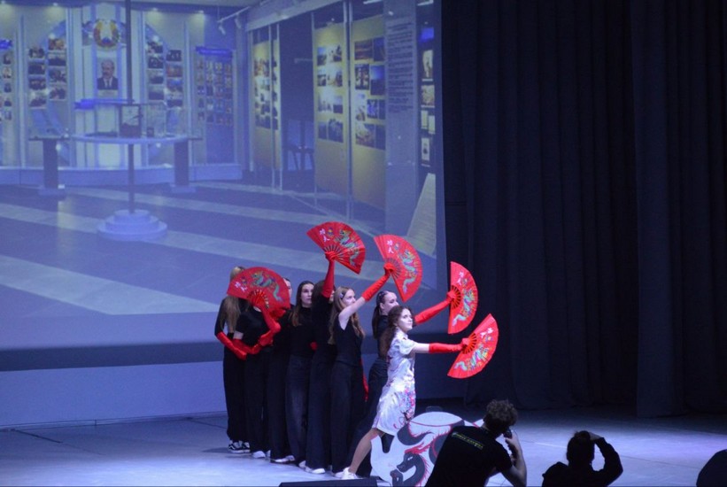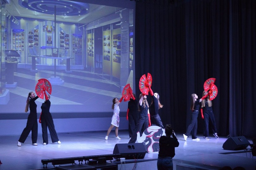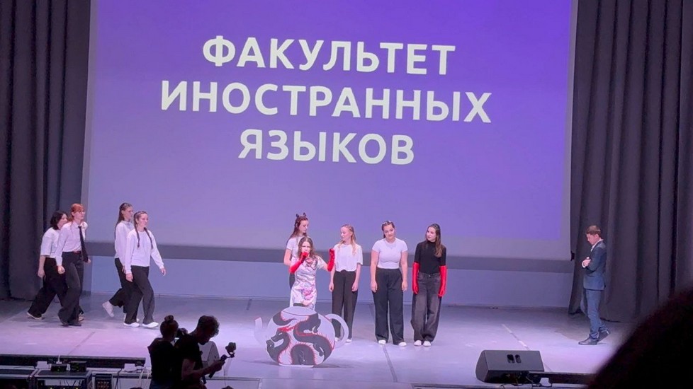 Визитная карточка иняза была оформлена как увлекательная презентация факультета, сочетающая информационную насыщенность и визуальную привлекательность. Зрители смогли «посетить» виртуальный музей с экспонатами из стран, языки которых изучают на факультете. Не менее впечатляющим оказался исполненный с изяществом китайский танец. В творческом номере соединились современные молодежные ритмы и движения.