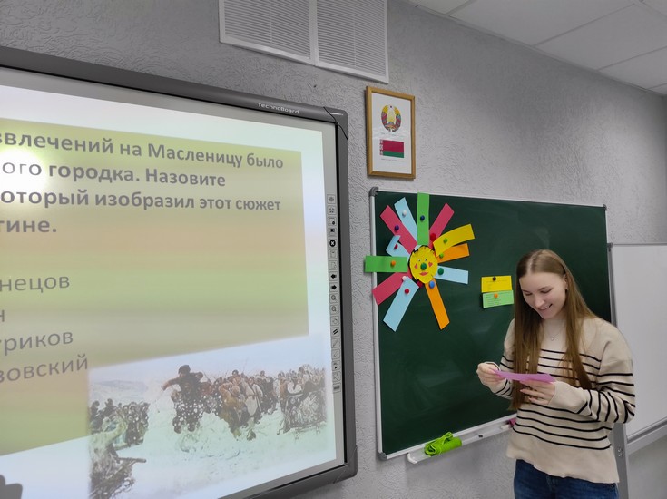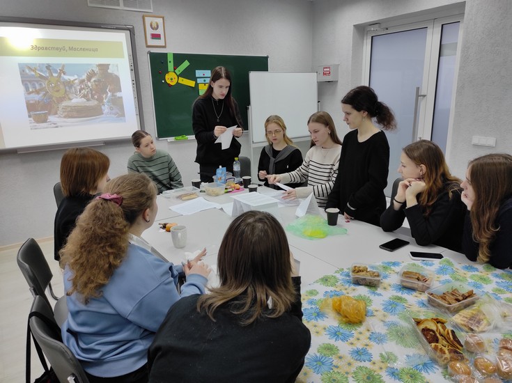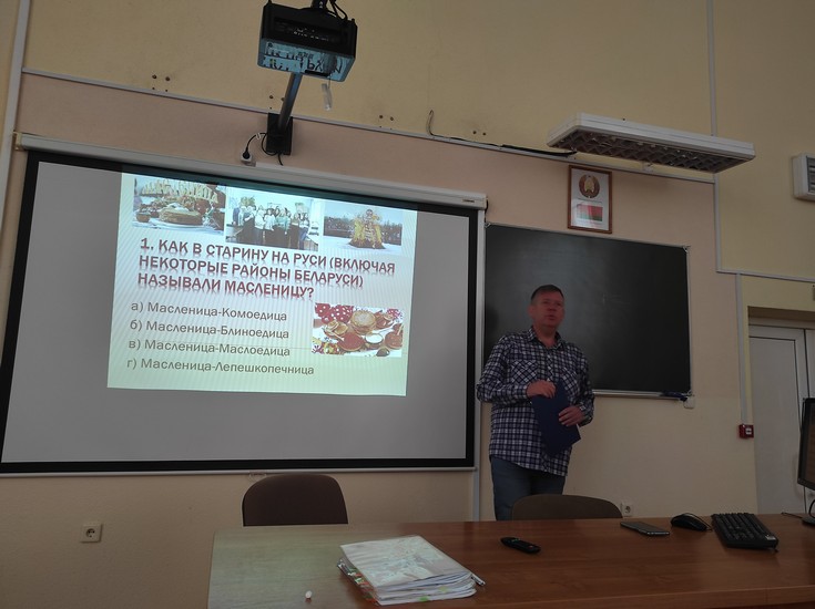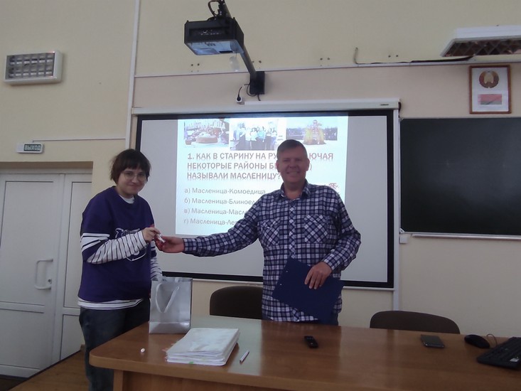 Старший преподаватель кафедры теоретической и прикладной лингвистики С. П. Зубрий провел увлекательную викторину. Вопросы касались истории праздника, значения каждого дня масленичной недели и символики блинов. Наши студенты справились на «отлично».