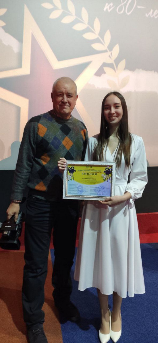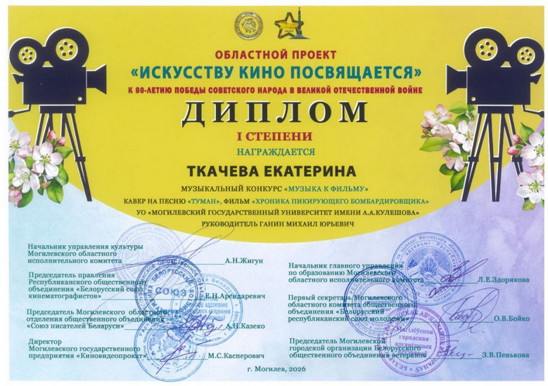 Областной творческий проект «Искусству кино посвящается», приуроченный к 80-летию Великой Победы, принес нашему факультету блестящую победу. Екатерина Ткачева завоевала диплом I степени в конкурсе «Музыка к фильму» с проникновенным кавером на песню «Туман» из фильма «Хроника пикирующего бомбардировщика» (1967). Руководитель проекта — Михаил Юрьевич Ганин. Жюри высоко оценило мастерство: исполнение Кати сумело точно передать трагический дух военного времени и сохранить верность глубокому смыслу легендарной киноленты.