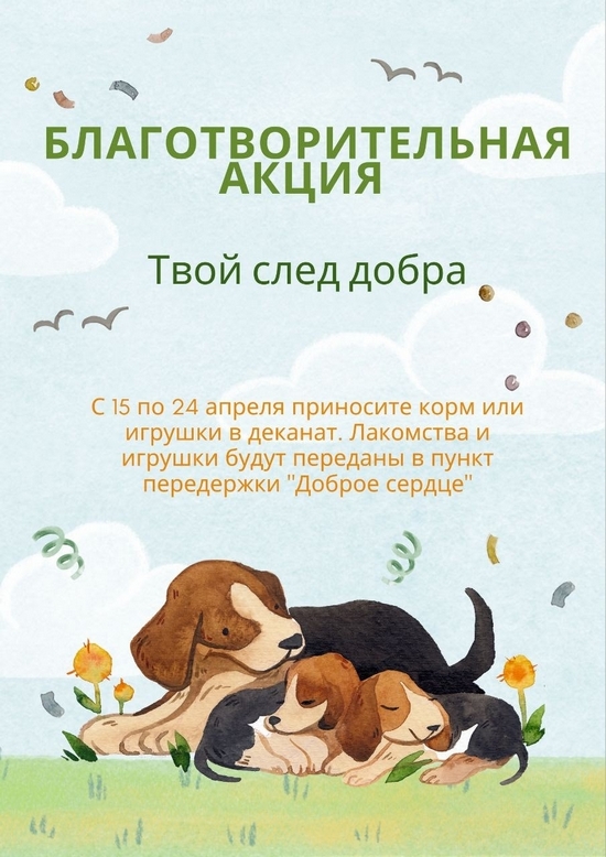 27 апреля в рамках благотворительной акции «Твой след добра» волонтёры факультета посетили пункт передержки бездомных собак «Доброе сердце». Студенты передали корм, провели время с уже знакомыми собаками и познакомились с новыми обитателями приюта.