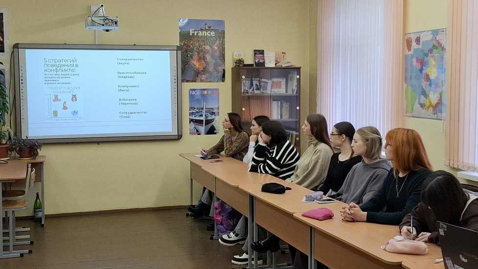 В группе 1112252 03.12.2025 состоялся информационный час, который был посвящен конфликтам, возникающим в группе людей. Ребята узнали о причинах конфликтов, а также о их разнообразных видах. Для лучшего понимания стратегии поведения существуют в психологии ассоциации конфликтов с типами животных (акула, медведь, лиса, черепаха, сова). Ребята обнаружили, что следование определенной тактике поведения обусловлено часто поставленным целям. Ребята узнали, как полученная информация может им помочь построить доброжелательные отношения и в целом эффективную коммуникацию.
