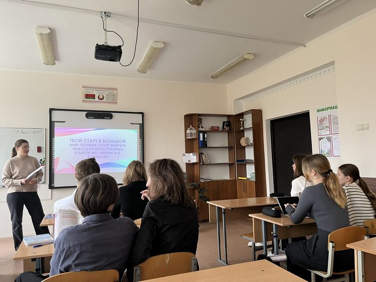 Студенты 4-ого курса факультета иностранных языков Виктория Романова, Ксения Денисенко, Юлия Халецкая, Мария Лобачева во время прохождения производственной практики в ГУО «Средняя школа №35 г. Могилева» под руководством методиста О. О. Резвовой провели ряд профориентационных бесед в 10-11 классах школы. Практиканты рассказали потенциальным абитуриентам о возможностях и преимуществах обучения на различных факультетах МГУ имени А. А. Кулешова, специальностях набора-2026.